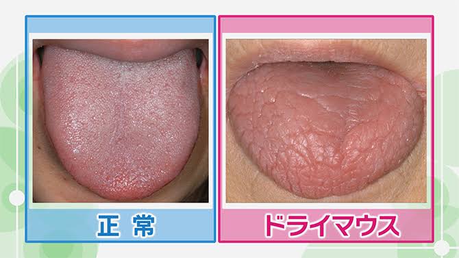 重度になると、唾液分泌量が低下し口腔内の乾きが進行し、口臭が強くなり、舌表面のひび割れや痛みで食事が採りにくくなる、